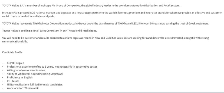 Πωλητή για την κατάστημα της Θεσσαλονίκης ψάχνει η Toyota.