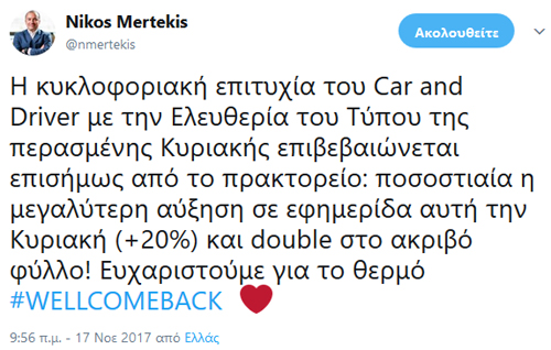 Πολύ καλά πήγε κυκλοφοριακά, σύμφωνα με τον διευθυντή Νίκο Μερτέκη, το «νέο» Car and Driver το οποίο κυκλοφόρησε πριν από μερικές ημέρες μαζί με την εφημερίδα Ελευθερία του Τύπου.