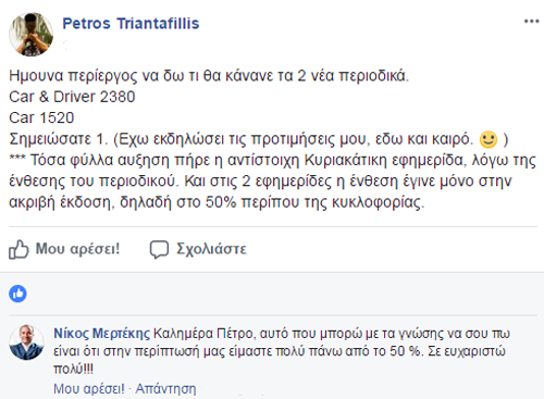 Τις έξτρα πωλήσεις των περιοδικών CAR και Car and Driver που κυκλοφόρησαν μαζί με τις εφημερίδες Πρώτο Θέμα και Ελευθερία του Τύπου ανήρτησε στο Facebook ο Πέτρος Τριανταφύλλης του Auto Τρίτη…