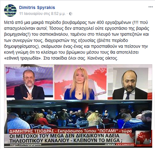 Στα… τσακίδια έστειλε με ανάρτησή του στο Facebook ο εκδότης του ixauto.gr Δημήτρης Σπυράκης τους 400 εργαζόμενους στο Mega που ενδέχεται να μείνουν στο δρόμο. Ο καθένας ας βγάλει τα συμπεράσματα του…