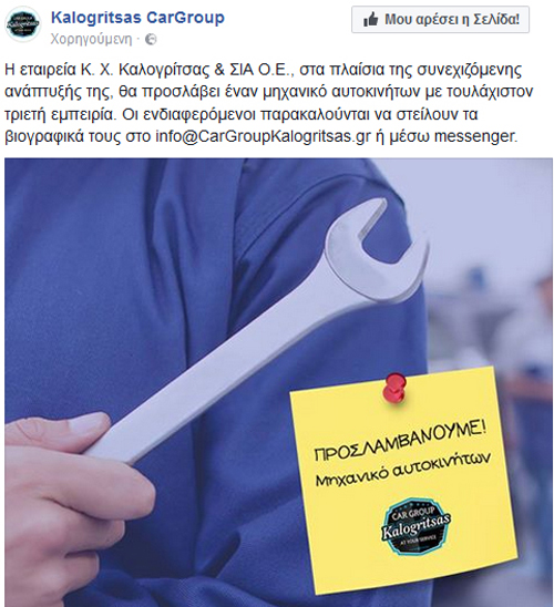 Μηχανικό με τριετή εμπειρία αναζητά η εταιρεία Κ.Χ. Καλογρίτσας και ΣΙΑ.