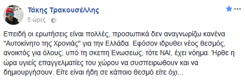 Ο Τάκης Τρακουσέλλης ελπίζει στην δημιουργία ενός θεσμού που θα έχει μέλη του δημοσιογράφους. Παράλληλα αδυνατεί να αναγνωρίσει το θεσμό Αυτοκίνητο της Χρονιάς για την Ελλάδα…