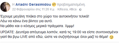 Αποκαλύψεις προαναγγέλει η Αριάδνη Γερασιμίδου μέσω Facebook στις 7 το απόγευμα. Για να δούμε άραγε τι έχει να πει. Το ζητούμενο είναι με αποδείξεις ή χωρίς;