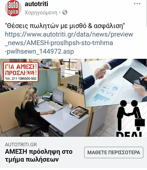 Το Auto Τρίτη αναζητά πωλητές για άμεση πρόσληψη.
