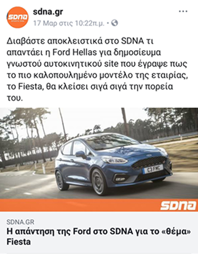 Ξεκάθαρη είναι πλέον η… κόντρα ανάμεσα σε newsauto.gr και sdna.gr με θέμα το νέο Ford Fiesta. Στο πρώτο, γράφτηκε πως το Fiesta ολοκληρώνει την σταδιοδρομία του ενώ στο δεύτερο (αθλητικό site) η Αριάδνη Γερασιμίδου γράφει για την πορεία του αυτοκινήτου που μόλις ξεκίνησε. Για να δούμε ποια θα είναι η συνέχεια…