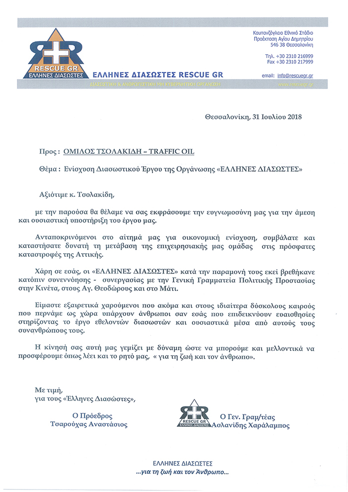 Η Traffic Oil ήταν από τις εταιρείες της… πιάτσας που στήριξε το έργο των διασωστών και ιδίως με τις πρόσφατες πυρκαγιες στο Μάτι. Μία κίνηση παράδειγμα προς όλους…