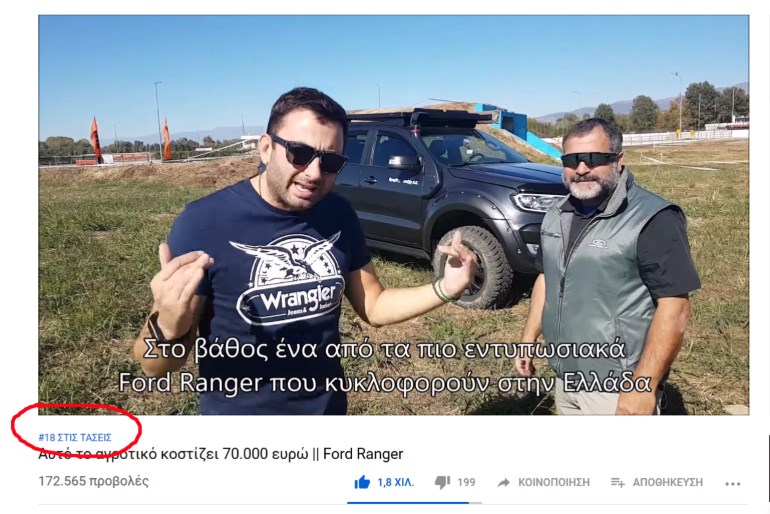 Στη θέση Νο18 σε όλη την Ελλάδα βρέθηκε το video που φτιάξαμε για το εντυπωσιακό Ford Ranger του Τάσου Χατζή αντιπροσώπου της Ford στη Θεσσαλονίκη. Χαρακτηριστικό το γεγονός πως σε πέντε ημέρες ξεπέρασε τις 172.500 θεάσεις!