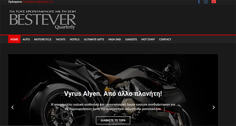 Μία νέα ιστοσελίδα ξεκίνησε την δραστηριότητά της με θεματολογία τα αυτοκίνητα, την μοτοσικλέτα, τα σκάφη και γενικότερα την πολυτέλεια. Πρόκειται για το bestever.gr με έδρα την Κύπρο στο οποίο αθρογραφεί μία μικρή ομάδα δημοσιογράφων και petrolheads με επικεφαλής τον Γιώργο Βαρίνο.