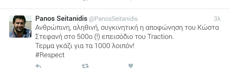 Να τις… χιλιάσει τις εκπομπές Traction ευχήθηκε ο Πάνος Σειτανίδης στον Κώστα Στεφανή. Θα… συμφωνήσουμε!