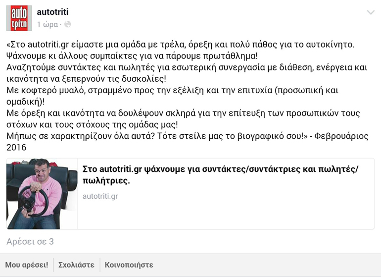 Συντάκτες με… άφθονη τρέλα, όρεξη και πάθος για το αυτοκίνητο αναζητά το autotriti.gr. Την ανακοίνωση την έβγαλε στο διαδίκτυο. Για να την δείτε πατήστε ΕΔΩ