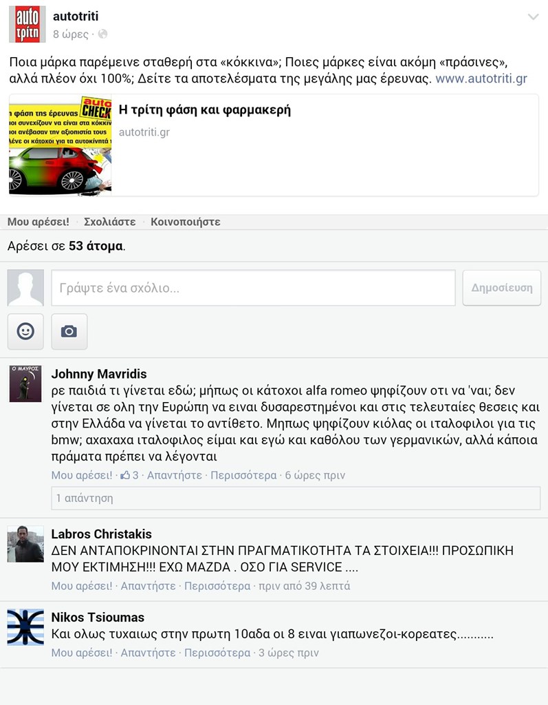 Μπορεί η παρουσίαση της έρευνας Auto Check του Auto Τρίτη στις εισαγωγικές να αναβλήθηκε μέχρι νεοτέρας ωστόσο… ανακοινώθηκαν τα αποτελέσματά της στα social media όπου έπεσε -εκτός του check των χρηστών του διαδικτύου – και «κράξιμο»… Μάλλον κάποιοι πρέπει να τσεκαρουν καλύτερα αυτούς που τσεκάρουν…