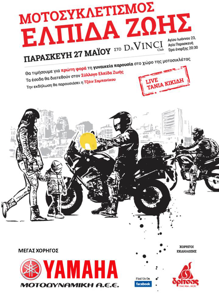 Χορηγός της εκδήλωσης «ΜΟΤΟΣΙΚΛΕΤΙΣΜΟΣ – ΕΛΠΙΔΑ ΖΩΗΣ» ήταν η εισαγωγική εταιρεία των μοτοσικλετών Μοτοδυναμική Α.Ε.Ε. που πραγματοποιήθηκε στις 27 Μαΐου. Η εκδήλωση ήταν αφιερωμένη στη γυναικεία παρουσία στον κόσμο της μοτοσικλέτας και περιλάμβανε γνωριμία με γυναίκες που δραστηριοποιούνται τόσο με ταξίδια, όσο και με τη συμμετοχή τους σε αγώνες, εντός και εκτός Ελλάδας. Τα έσοδα της εκδήλωσης θα δοθούν στο Σύλλογο Κακοποιημένων Γυναικών «Ελπίδα Ζωής».