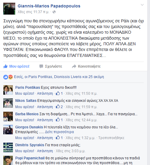 Τα… ‘χωσε στην ομάδα του Διαμαντή Τζαμπάζη ο Γιάννης – Μάριος Παπαδόπουλος ο οποίος ορθά τόνισε πως δεν γίνεται να κάνεις παρουσίαση με αυτοκίνητο που θα τρέξει στο WRC και να μην έχεις προσκαλέσει το κανάλι που δείχνει τους αγώνες!