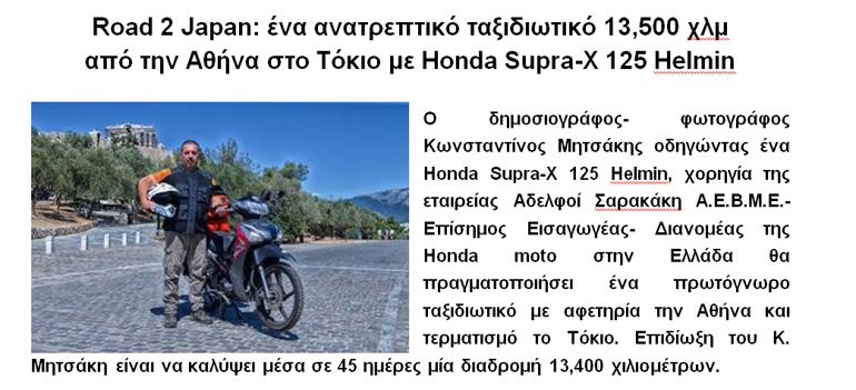 Σε δελτίο Τύπου διαβάσαμε πως ο ταξιδευτής (με μοτοσικλέτες) και δάσκαλος στο επάγγελμα Κώστας Μητσάκης, που πρόσφατα ξεκίνησε με… παπάκι για την Ιαπωνία είναι δημοσιογράφος!!! Μήπως έχει γίνει κάποιο λάθος ή συμβαίνει κάτι που δεν ξέρουμε; Σε κάθε περίπτωση πρέπει να υπάρχει σεβασμός σε όσους έχουν την δημοσιογραφία ως κύριο επάγγελμα και αυτό αποδεικνύεται…