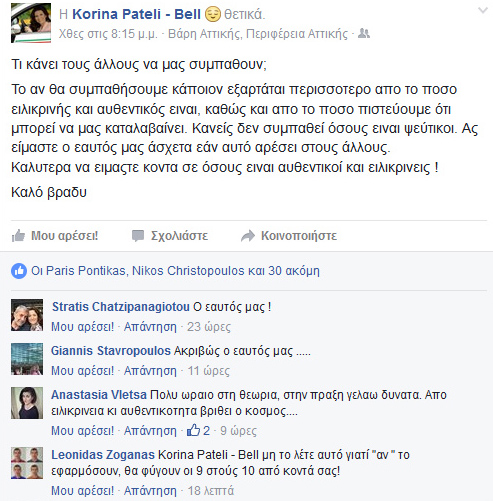 Στην ειλικρίνεια και την αυθεντικότητα αναφέρθηκε η επικεφαλής επικοινωνίας του Fiat Group Hellas Κορίνα Πατέλη Μπελ στο Facebook. Θα συμφωνήσουμε απόλυτα…