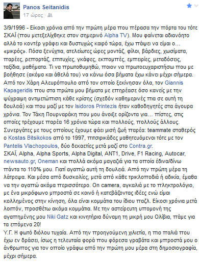 Είκοσι χρόνια στην… πιάτσα μετρά ήδη ο Πάνος Σειτανίδης. Ένας μάχιμος, σεμνός ρεπόρτερ με ήθος και αξιοπρέπεια. Του ευχόμαστε ακόμα μεγαλύτερες επιτυχίες.