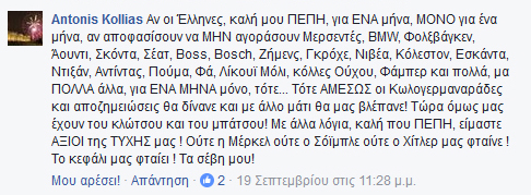 Τη μία εβδομάδα ο Αντώνης Κόλλιας, μέλος του Αυτοκινήτου της Χρονιάς κάνει ανάρτηση για… κωλογερμαναράδες και εμπάργκο στις πωλήσεις γερμανικών αυτοκινήτων και προϊόντων και την άλλη ανεβάζει φωτογραφία από το περίπτερο της Opel στην έκθεση του Παρισιού. Όπως θα δείτε πάντως στην ανάρτηση για τους Γερμανούς πουθενά η λέξη Opel… Μάλλον είναι, άλλοι Γερμανοί αυτοί της Opel!