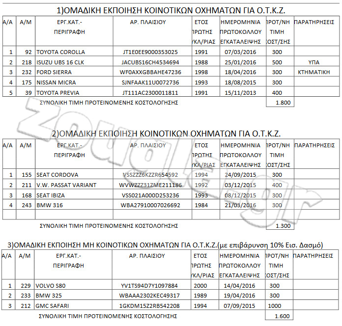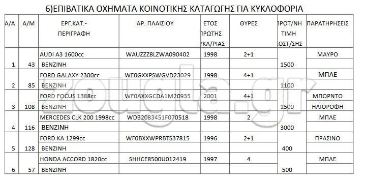 Συγκεκριμένα, θα δημοπρατηθούν 12 οχήματα που προορίζονται για διάλυση με τιμή 4.700 ευρώ ενώ υπάρχουν και άλλα 6 με τιμή εκκίνησης τα 500 ευρώ (Honda Accord), τα οποία θα δημοπρατηθούν και θα μπορούν να κυκλοφορήσουν κανονικά.