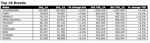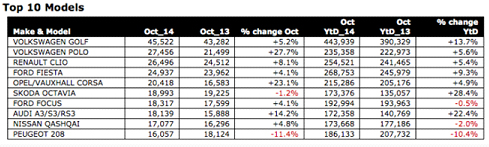 Όσον αφορά τα πιο μοσχοπουλημένα αυτοκίνητα για το πρώτο δεκάμηνο του έτους, τo VW Golf βρίσκεται στην κορυφή και ακολουθούν Renault Clio και VW Polo. To Audi A3 είναι το κορυφαίο σε πωλήσεις premium μοντέλο ενώ το Nissan Qashqai με 173.668 ταξινομήσεις βρίσκεται στην κορυφή των SUV οχημάτων και παράλληλα το μοναδικό ιαπωνικό που το συναντάμε εντός δεκάδας.