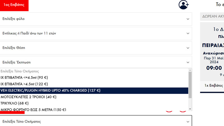 Σήμερα, επισκεφθήκαμε το site γνωστής ελληνικής ακτοπλοϊκής εταιρίας για να κλείσουμε ένα εισιτήριο από Πειραιά προς Ηράκλειο. Όπως θα δείτε και στη φωτογραφία, η μεταφορά ηλεκτρικού ή Plug-in υβριδικού οχήματος, είναι ακριβότερη από αυτή ενός οχήματος που χρησιμοποιεί συμβατικά καύσιμα.