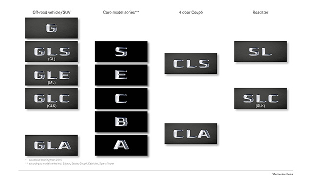 Σύμφωνα με τα καινούργια δεδομένα, σε όλα τα SUV τα δύο πρώτα γράμματα θα είναι «GL» ενώ το τρίτο γράμμα θα αναφέρει το μοντέλο της «βασικής» γκάμας. Για παράδειγμα, η GLK θα μετονομαστεί σε GLC ώστε να τονίζεται η αντιστοιχία της με την C-Class, η ML σε GLE, και η GL θα γίνει GLS.