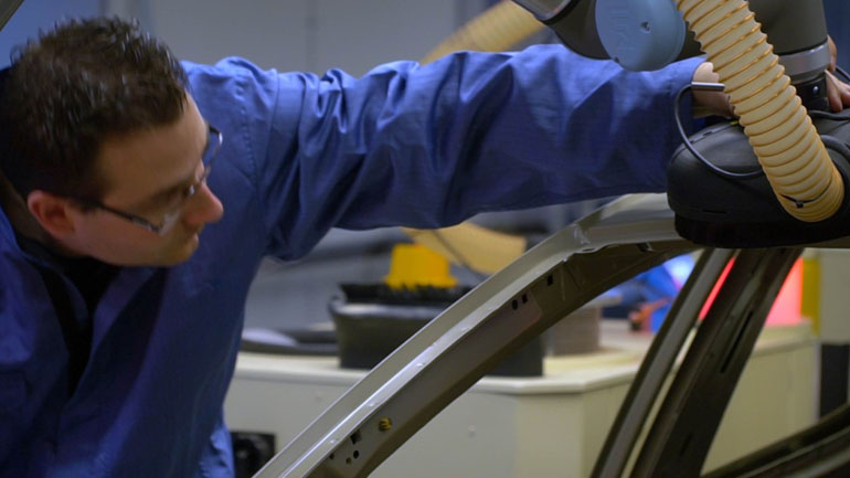 Εκτελώντας με απόλυτο συγχρονισμό και ακρίβεια τις κινήσεις τους, βάφουν ολόκληρη την επιφάνεια του αμαξώματος σε μόλις 35 δευτερόλεπτα. Το εύκαμπτο υπόστρωμα – προϊόν τρισδιάστατης εκτύπωσης – που υπάρχει μεταξύ του ρομποτικού βραχίονα και του γυαλόχαρτου, επιτρέπει στο cobot να εργάζεται με την επιδεξιότητα ενός ανθρώπινου χεριού.