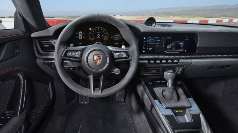 Στο εσωτερικό υπάρχουν πολλές από τις αλλαγές που είδαμε στη νέα 911 Carrera, αλλά η GT3 διατηρεί τον περιστροφικό διακόπτη εκκίνησης και όχι μπουτόν. Υπάρχει μια νέα σχεδίαση καθισμάτων μπάκετ από ανθρακονήματα με αναδιπλούμενη πλάτη και προαιρετική θέρμανση, ενώ στην GT3 Touring, μπορείτε να επιλέξετε πίσω καθίσματα, για πρώτη φορά σε GT3 μοντέλο στην ιστορία.