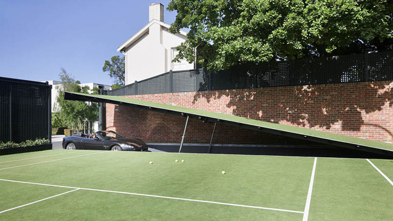 Αυτό που εντυπωσιάζει είναι ο τρόπος που εισέρχονται και εξέρχονται τα αυτοκίνητα από το γκαράζ. Η είσοδος είναι ουσιαστικά «κρυμμένη» στο γήπεδο του τένις. Πατώντας ένα κουμπί το κορτ σηκώνεται και αποκαλύπτεται η ράμπα όπου περνούν τα οχήματα.