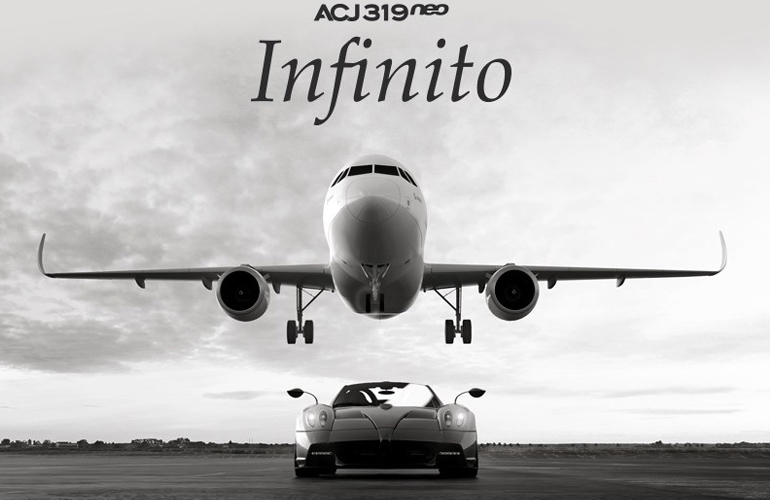 Οι σχεδιαστές της Pagani έχουν χρησιμοποιήσει τα πιο προηγμένα υλικά, συνδυάζοντας το δέρμα, με το ξύλο, το γυαλί, το αλουμίνιο και το Carbo Titanium. Η καμπίνα ««Infinito» θα κάνει πρεμιέρα στο Airbus ACJ320, προσφέροντας στους πάμπλουτους επιχειρηματίες και VIP μια μοναδική εμπειρία.