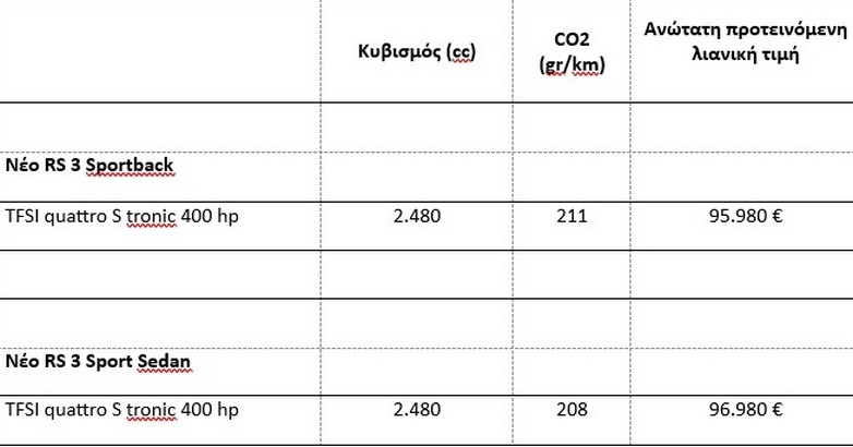 Τα νέα μοντέλα RS 3 Sportback και Sport Sedan, που κατασκευάζονται στο εργοστάσιο της Audi στο Ingolstadt, θα κυκλοφορήσουν στην Ελλάδα στις αρχές Απριλίου. Τα νέα μοντέλα RS 3 είναι διαθέσιμα για παραγγελία με τις παρακάτω τιμές: