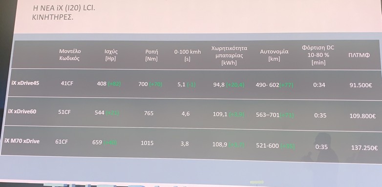Στη βάση της γκάμας συναντάμε την iX XDrive45, η οποία παράγει 408 ίππους (+82) και 700 Nm ροπής (+70), επιτρέποντας επιτάχυνση 0-100 χλμ./ώρα εντός 5,1 δευτ. Η μπαταρία της, χωρητικότητας 94,8 kWh υπόσχεται αυτονομία 602 χλμ. και από φορτιστή DC φτάνει 10-80% σε 34 λεπτά.