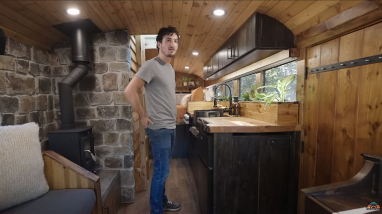 Τέλος, ένα μικρό μπάνιο βρίσκεται ανάμεσα στην κρεβατοκάμαρα και την ξυλόσομπα. Αξίζει να αναφέρουμε πως ο Μάικ χρειάστηκε δύο χρόνια για να φτιάξει το λεωφορείο και σίγουρα του κόστισε λιγότερο από το να αγοράσει ένα σπίτι.