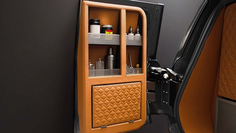 Δίχρωμο δέρμα με προσαρμοσμένο μοτίβο κοσμεί τα καθίσματα και τις επενδύσεις των θυρών, με μεταλλικά στοιχεία από ορείχαλκο και τιτάνιο και πέτρα από σχιστόλιθο Dekton. Το δέρμα πλαισιώνει επίσης τον πίσω φούρνο, την πλαϊνή καμπίνα και τους πίσω αποθηκευτικούς χώρους. Το SUV φοράει προσαρμοσμένες ζάντες και μοναδικές εξωτερικές επενδύσεις αν και με έναν φούρνο μέσα, κανείς δεν θα ασχολείται με τις ζάντες.