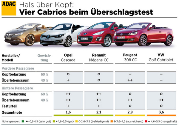 Τα αποτελέσματα είναι πολύ ενδιαφέροντα, με το Cascada να αναδεικνύεται το ασφαλέστερο όλων και το Golf Cabriolet (προηγούμενης γενιάς) να λαμβάνει τη χαμηλότερη βαθμολογία. Το θέμα στην περίπτωση ανατροπής ενός ανοικτού αυτοκινήτου, είναι τα κεφάλια των επιβατών να μην ακουμπήσουν στην άσφαλτο.