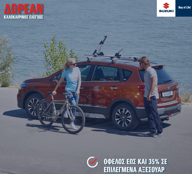 Επίσης, πραγματοποιώντας το προγραμματισμένο service ή οποιαδήποτε επισκευή του οχήματος σε εξουσιοδοτημένο επισκευαστή, η Suzuki κάνει δώρο τον Φ.Π.Α. Η προσφορά ισχύει για αυτοκίνητα που ταξινομήθηκαν έως 31 Δεκεμβρίου 2013 και αποδίδεται συνολικά στο κόστος ανταλλακτικών και εργασιών. Εξαιρούνται τα ανταλλακτικά φανοποιίας, τα αξεσουάρ και τα ελαστικά.