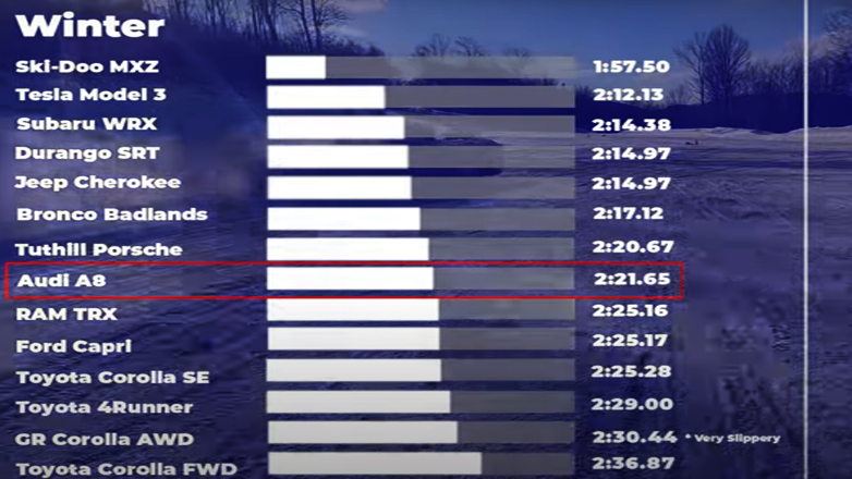 Τι κι αν το A8L είναι κατασκευασμένο για πολυτελείς μετακινήσεις και όχι για αγώνες, τα πήγε περίφημα σε μία αυτοσχέδια Ε.Δ. κατά τη διάρκεια μιας χειμερινής δοκιμής που διοργανώθηκε από την Team O’Neil Rally School στο New Hampshire. Παρά το τεράστιο βάρος του και το μακρύ μεταξόνιο, παραμένει ψύχραιμο τόσο στις κλειστές στροφές όσο και στις στροφές υψηλής ταχύτητας.