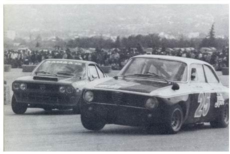 Η αγάπη του για τους αγώνες ήταν γνωστή. Στην φωτογραφία οδηγεί μία Alfa Romeo GTA σε μια μονομαχία με τον Παύλο Μαδέντζη (Lancia Beta)…