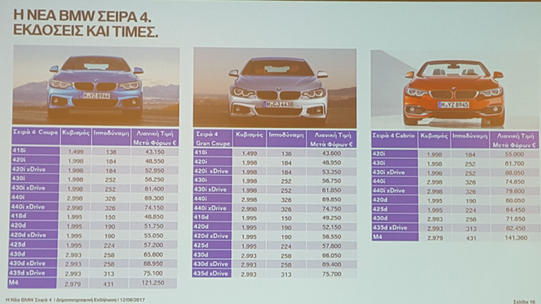 Η BMW Hellas ανακοίνωσε τις τιμές του μοντέλου, το οποίο συνεχίζει να διατίθεται σε τρεις τύπους αμαξώματος (Coupe, Gran Coupe και Cabrio). Οι δύο πρώτες εκδοχές έχουν βασικό κινητήρα τον εξαιρετικό 1.5 Twin Power Turbo των 136 ίππων, ενώ η ανοικτή τον δίλιτρο turbo με τους 184 ίππους.