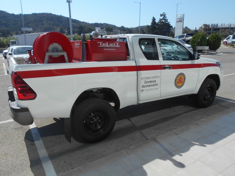 Το συγκρότημα πυρόσβεσης διαθέτει ειδικό πλαίσιο, εγκατεστημένη δεξαμενή χωρητικότητας 600 LT με χαμηλό κέντρο βάρους, αντλία νερού με κινητήρα και πιστόλι διασποράς νερού. Το HILUX είναι κορυφαίο στην κατηγορία του. Αξιόπιστο για κίνηση σε δυσπρόσιτες περιοχές. Είναι ένα πολύτιμο δώρο στους εθελοντές δασοπυροσβέστες της Ρόδου που όταν χρειασθεί δίνουν μάχη για να σώσουν ανθρώπινες ζωές αλλά και τον πνεύμονα ζωής. Τα δάση μας.