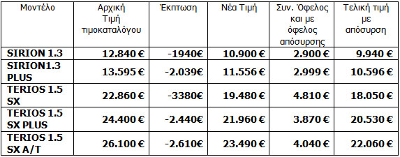 Συγκεκριμένα το Sirion 1.3 διαθέτει έκπτωση 1.940 ευρώ και σε συνδυασμό με το όφελος απόσυρσης (το οποίο κάνει δώρο η εταιρεία) η τεική τιμή αγγίζει τα 9.940 ευρώ. Στην περίπτωση του Terios με τον κινητήρα των 1.5 λίτρων η τιμή φτάνει τα 18.050 ευρώ (αρχική τιμή: 22.860€) στην οποία συμπεριλαμβάνεται έκπτωση 3.380 ευρώ και όφελος απόσυρσης.