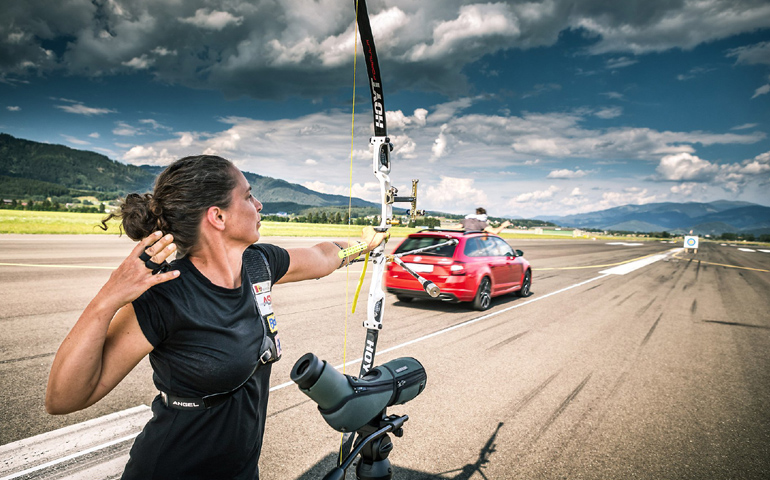 Η τσεχική μάρκα έβαλε έναν εκπαιδευτή πολεμικών τεχνών στο εσωτερικό του «καυτού» wagon. Ο επαγγελματίας οδηγός ανέπτυξε τη μέγιστη ταχύτητα, πέρασε δίπλα από την Laurence Baldauff και, τότε, η τοξοβόλος τέντωσε τη χορδή και άφησε το βέλος να σκίσει τον αέρα.