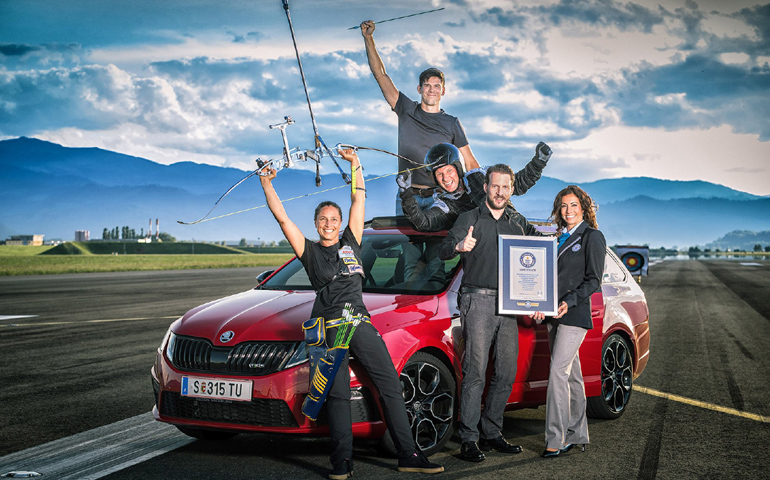 Ο Markus Haas έβγαλε το σώμα του από την ηλιοροφή της Skoda και έπιασε το βέλος στον αέρα, τη στιγμή που αυτό κινούνταν με 216 χλμ./ώρα. Το ρεκόρ πιστοποιήθηκε από τους ανθρώπους του οργανισμού Guiness World Records.