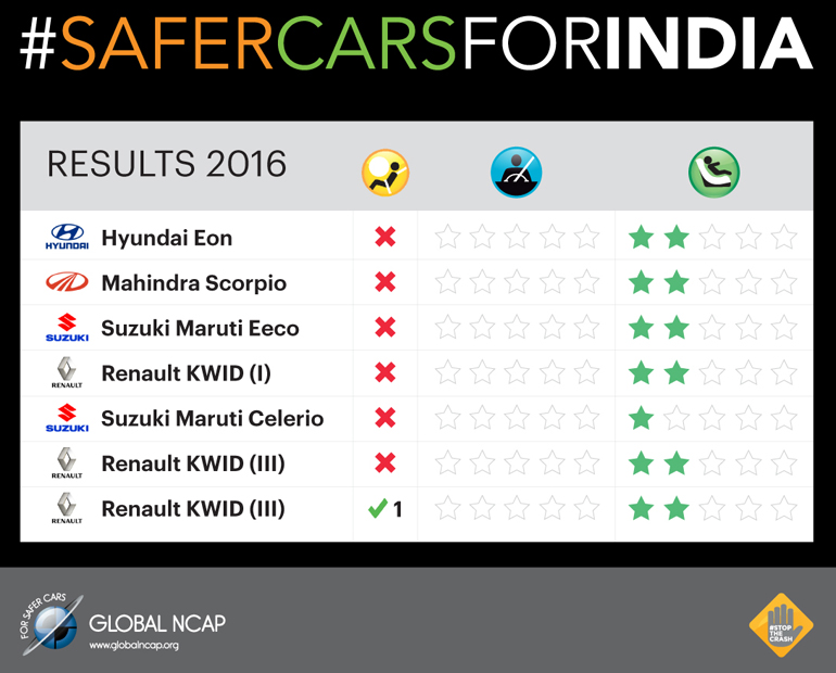 Όπως ανακοίνωσε ο οργανισμός, τα Renault Kwid, Maruti Suzuki Celerio, Maruti Suzuki Eeco, Mahindra Scorpio και Hyundai Eon (Atos) δεν κατάφεραν να πάρουν ούτε ένα αστέρι! Όλα υποβλήθηκαν σε μετωπική πρόσκρουση με 64 χλμ./ώρα, αλλά κανένα δεν μπόρεσε να περάσει τα crash test στην προστασία ενήλικων επιβατών. Το Kwid, μάλιστα, δοκιμάστηκε σε τρεις διαφορετικές εκδόσεις, μεταξύ των οποίων η μία με αερόσακο οδηγού.