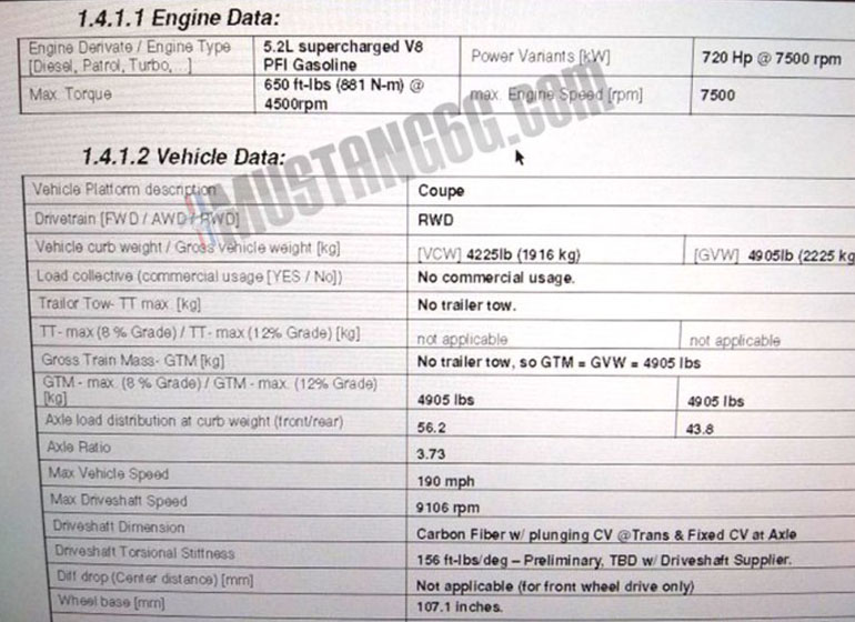 Η νέα Shelby GT500 θα κάνει παγκόσμια πρεμιέρα στις 14 Ιανουαρίου του 2019 και, σύμφωνα με ένα έγγραφο που διέρρευσε, τροφοδοτείται από τον V8 5,2 λίτρων κινητήρα απόδοσης 720 ίππων στις 7.500 σ.α.λ. και 881 Nm ροπής στις 4.500 σ.α.λ. Το βάρος του αυτοκινήτου είναι στα 1.916 κιλά, με το κοντέρ να σταματά στα 305 χλμ./ώρα.