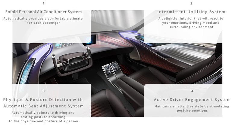 Αισθητήρες παρακολουθούν κάθε κίνηση των επιβατών και ανιχνεύουν τα συναισθήματά τους, προσαρμόζοντας ανάλογα τη θέση των καθισμάτων, τον φωτισμό στην καμπίνα, τη μουσική και τον κλιματισμό σε κάθε έναν ξεχωριστά. Το σύστημα ψυχαγωγίας και ενημέρωσης ελέγχεται μέσω αφής, χειρονομιών ή φωνητικών εντολών.