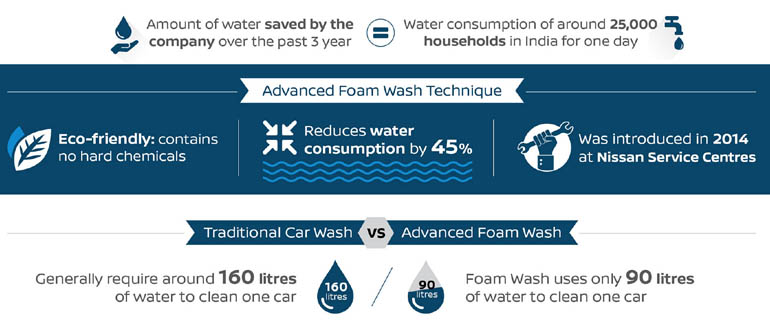 Προκειμένου να εξοικονομήσει το πολυτιμότερο αγαθό, η Nissan εφάρμοσε μια προηγμένη τεχνική στην Ινδία με την ονομασία «Foam Wash», σε όλο το δίκτυο εξυπηρέτησης πελατών, υπογραμμίζοντας τη δέσμευσή της στο όραμα της βιώσιμης κινητικότητας, στους πελάτες της και στην κοινωνία.