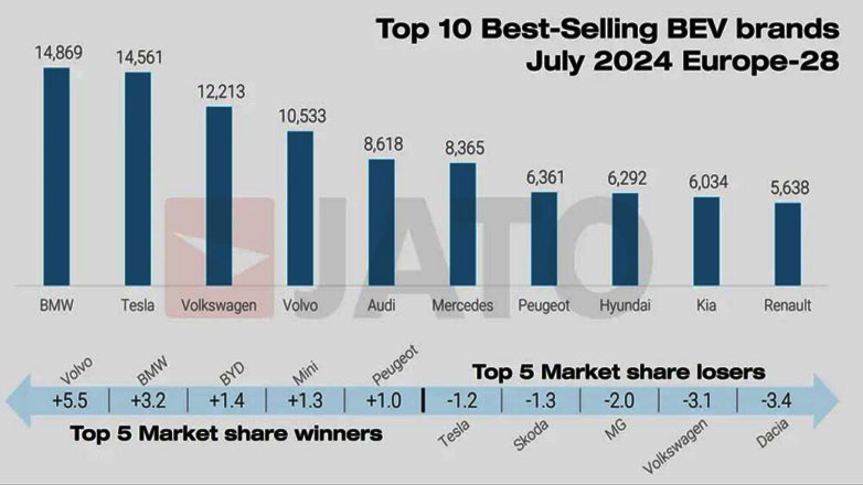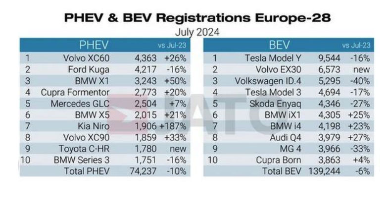 Παρόλα αυτά, τον Ιούλιο, ο συνολικός αριθμός των πωλήσεων EV στην Ευρώπη μειώθηκε κατά 6% σε ετήσια βάση. Η JATO Dynamics αναφέρει ότι η μείωση αυτή οφείλεται πιθανότατα στην έλλειψη κυβερνητικών κινήτρων και στις ανησυχίες σχετικά με τις τιμές μεταπώλησης.
