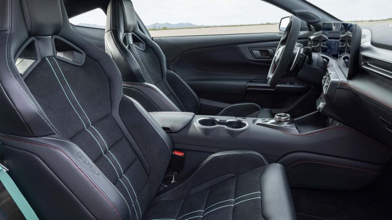 Στο εσωτερικό, η Mustang Dark Horse SC υιοθετεί στοιχεία από τη GTD όπως flat-bottom τιμόνι με ενσωματωμένα controls, Alcantara & carbon-fiber accents και προαιρετικά Recaro sport καθίσματα, προσφέροντας οδηγική αμεσότητα και σπορ στήσιμο.