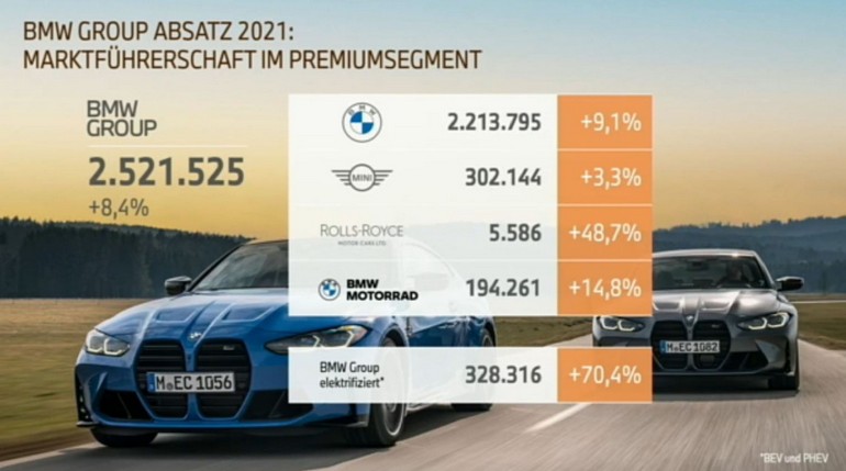 Η BMW Group πούλησε 2.521.514 αυτοκίνητα το 2021 (2.213.795 BMW, 302.144 MINI και 5.586 Rolls-Royce). Το περιθώριο κέρδους του αυξήθηκε στο 10,3%, που είναι το υψηλότερο από το 2017.