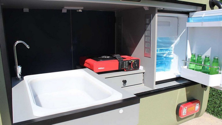 Η πίσω πόρτα τύπου roll-up, όταν ανοιχτεί αποκαλύπτει και την ειδικά ενσωματωμένη κουζίνα η οποία διαθέτει νεροχύτη και εστίες για μαγείρεμα ενώ ακριβώς δίπλα υπάρχει και ένα ψυγείο χωρητικότητας 49λτ.